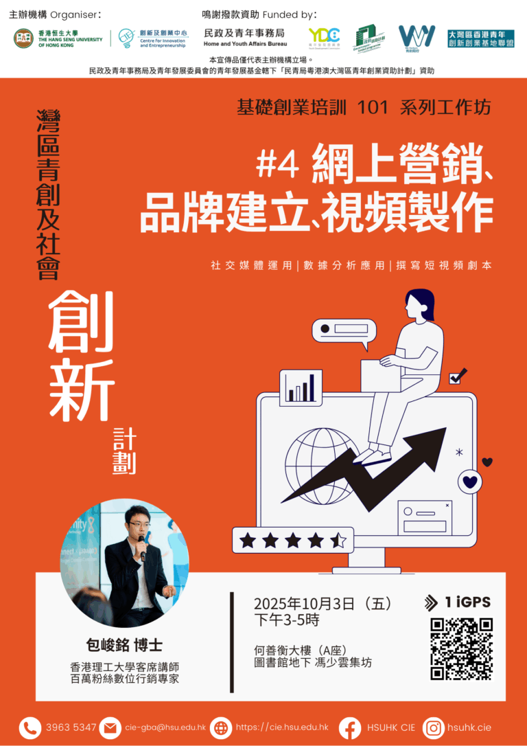 創新及創業中心(CIE)推出的「基礎創業101」系列工作坊,帶你創業!第四場工作坊教你如何利用社交媒體營銷,以數位策略讓創業項目脫穎而出,引來市場關注!