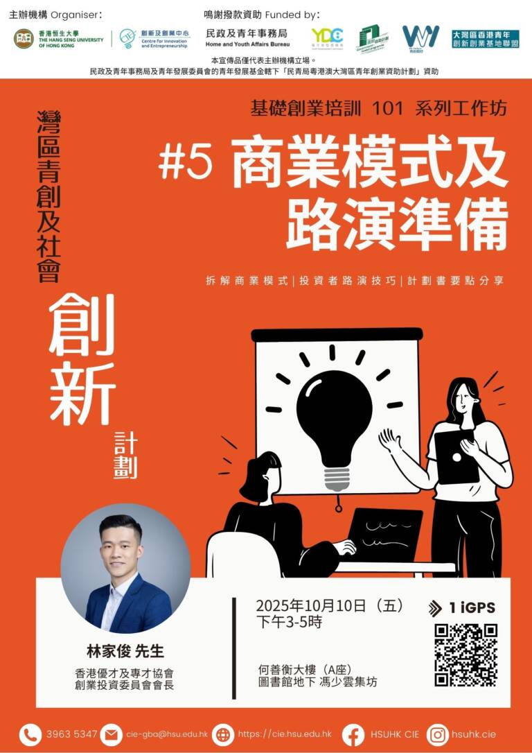 由 創新及創業中心(CIE) 主辦的基礎創業培訓 101 系列工作坊 第五堂將聚焦剖析商業模式精髓與路演技巧,教你如何更具說服力地吸引投資者!