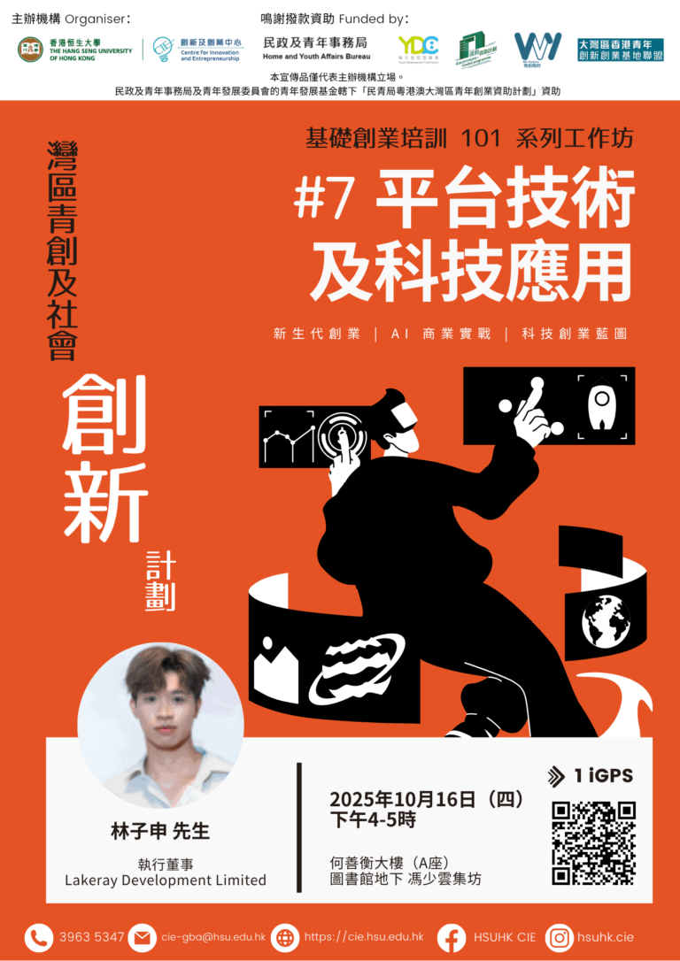 | 🎯 全程參與的恒大同學生將可獲得 1 個 iGPS 分數 ⌛ 名額有限,先到先得 📝參與本工作坊系列的出席率,或影響「青創計劃」的最終評選結果 🎓參加6堂或以上工作坊將會獲得課程結業證書 |